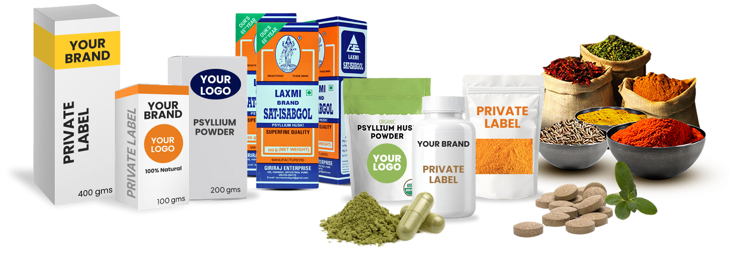 In addition to Psyllium Husk, Giriraj Enterprise also offers private labeling for a wide range of spices and food products, including Ajwain, Coriander Powder (Dhaniya), Cumin Seeds (Jeera), Dhana Jeeru, Fennel Seeds (Sauff), Fenugreek (Methi), Kashmiri Mirch, Mustard Seeds (Rai), Red Chilli Powder, Sesame Seeds (Till), Turmeric Powder (Haldi), as well as Corn Starch, Edible Oils, and more.